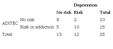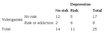 There were a total of 8 participants with a risk of video game addiction and 11 with symptoms of depression. When crossing the data, we saw that those 12 subjects, practically half of the sample, did not present a risk of addiction to video games or signs of depression, while there were 2 subjects with addiction or risk of addiction to video games and who did not present depressive symptoms. On the other hand, we found a total of 5 participants with a risk of suffering depression and no risk of addiction to video games, while there were 6 participants who obtained a score indicating a risk of addiction or addiction to video games and, in addition, present depressive symptoms.