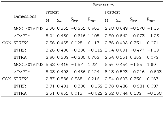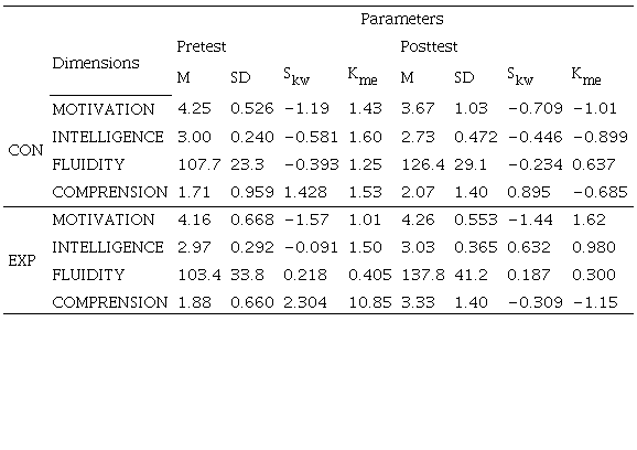 The standard deviation is well below one point in all the study dimensions, both in the pretest and posttest measures, except in the posttest measures of the control group, which are slightly above 1. The students tend to agree on their answer. Most of the asymmetry and kurtosis values are between ± 1.96, considered within a normal distribution.