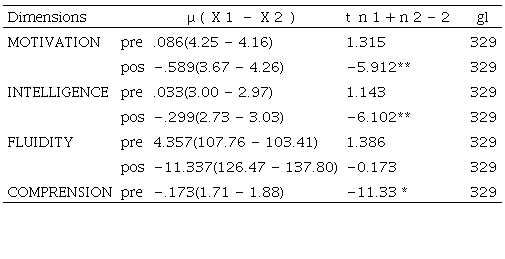 In this dimensional analysis of emotional intelligence Table 7, the means reached in the pretest and posttest measures of the control group and the experimental group show that in the control group the tendency is downward, while in the experimental group it is upward. The analysis of each of the dimensions of emotional intelligence shows that in the pretest measures of the control group, the Mood dimension is the one with the highest mean, while the Stress dimension is the one with the lowest mean. In the pretest measures of the experimental group, the dimension with the highest mean is FEELING, while the dimension with the lowest mean is STRESS. In the posttest measures of the control group, the dimension with the highest mean is INTER, while the dimension with the lowest mean is INTRA. In the posttest measures of the experimental group, the dimension with the highest mean is INTER. On the other hand, the dimension with the lowest mean is INTRA.