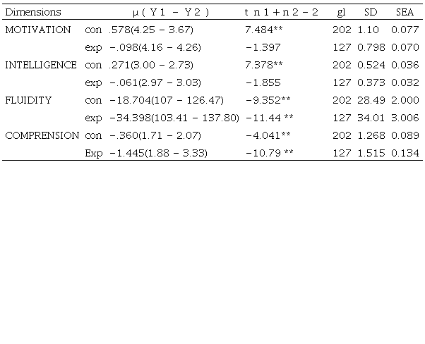 The degree of independence of the results obtained was measured with Student’s t-statistic, although from two different perspectives. On the one hand, independent samples were analyzed, i.e., a comparison was made between the control and experimental groups, both in the pretest and posttest tests. The data show Table 2 that in the post-test measurements statistically significant differences were found between the control group and the experimental group. In this case, the measures achieved by the experimental group are higher than those of the control group.