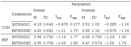 As it is shown in Table 4, the measures achieved in the pretest and posttest measures of the control and experimental groups in intrinsic and extrinsic motivation, it can be observed that in the control group the tendency is downward, while in the experimental group it is upward. In both cases, extrinsic motivation is higher than intrinsic motivation in the pretest and posttest measures.