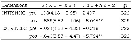 On the other hand, related samples were analyzed between the pretest and posttest of the control and experimental groups (Table 6). In this analysis, statistically significant differences were observed in the control group, both in intrinsic and extrinsic motivation. That is, the mean differences between pretest and posttest measures in the control group are significant. In this case, the pretest means are higher than the posttest measures.