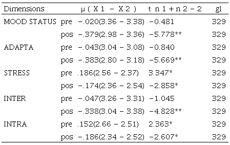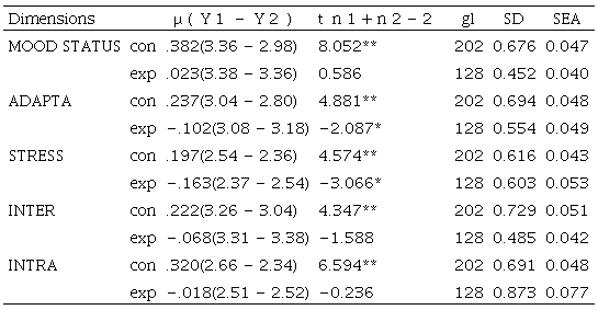 On the other hand, related samples were analyzed, that is, between the pretest and posttest of the control and experimental groups (Table 9). Statistically significant differences are observed in all dimensions of the control group. The means achieved in the pretest measures are higher than those achieved in the posttest measures. In the ADAPTA and STRESS dimensions of the experimental group, statistically significant differences are observed. The measures reached in the post-test measures are higher than those reached in the pre-test measures.