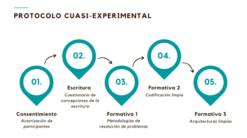 Para alcanzar el objetivo se planteó un estudio relacional cuasi-experimental en la asignatura de ingeniería de software. En la Figura 1 se presenta el protocolo experimental utilizado en este estudio.