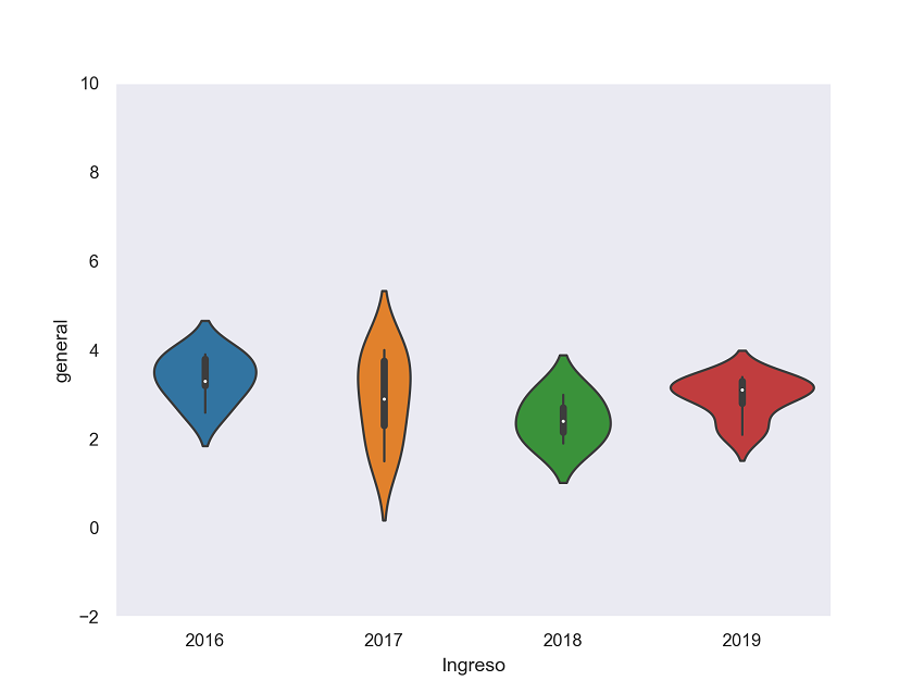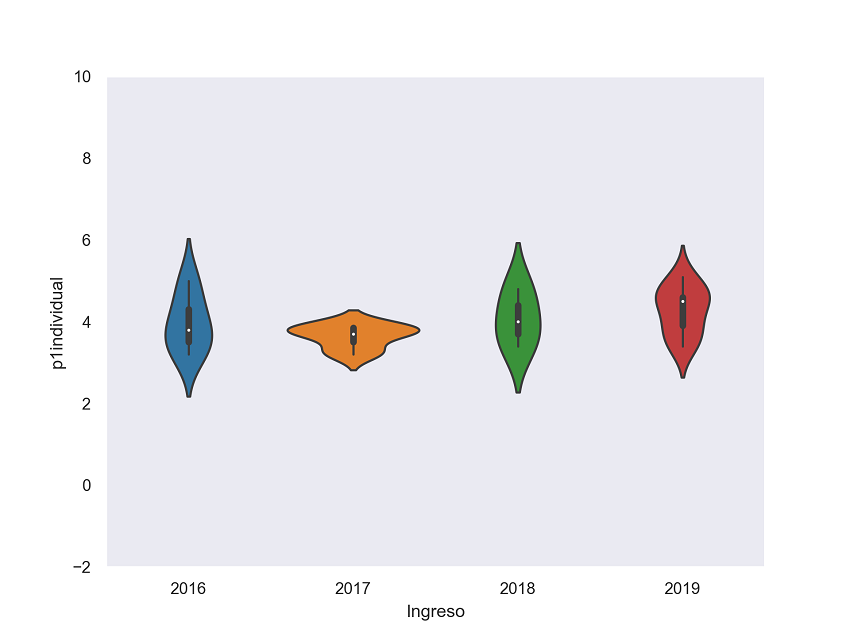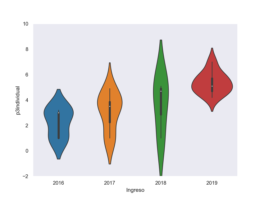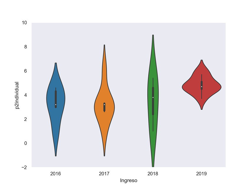 La Figura 3 corresponde a la distribución de calificaciones de los estudiantes en la segunda evaluación de la asignatura (eje vertical), organizados por año de ingreso (eje horizontal). Nuevamente se aprecian diferencias entre generaciones, donde los estudiantes que ingresaron en los años 2018 y 2019 logran un mejor desempeño, con una media de 4.8. Mientras que las generaciones mayores alcanzan calificaciones en torno al 3.3, considerando que la aprobación se logra sobre el 4.0. Por lo tanto, en esta segunda calificación se repite la relación entre la cohorte y el desempeño académico logrado por los participantes.