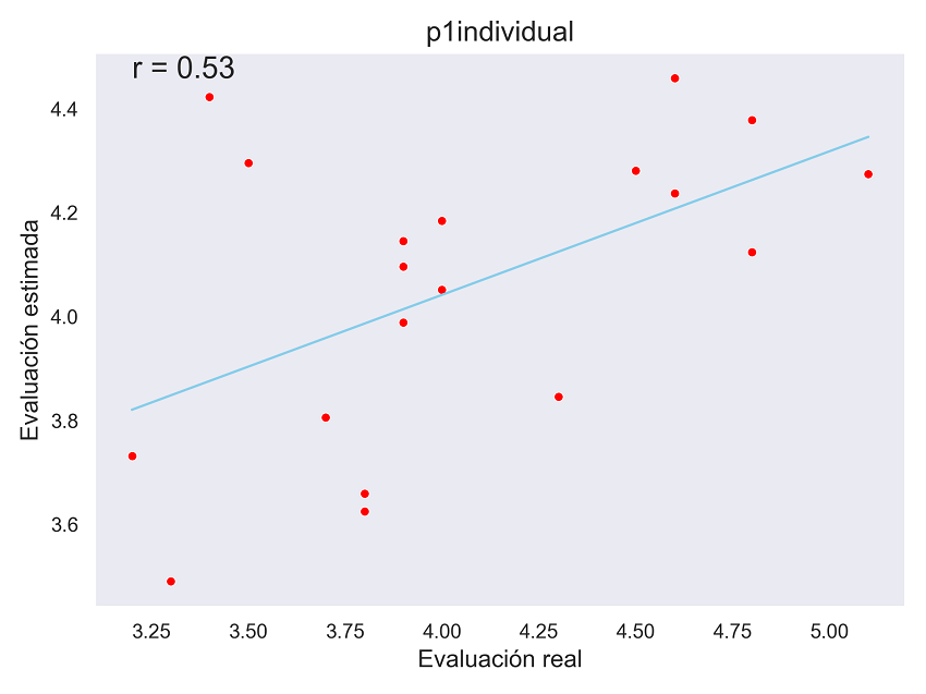 En la Figura 7, se presenta la precisión alcanzada por un modelo de regresión lineal construido a partir de las dimensiones del cuestionario de escritura en conjunto con la variable de cohorte con el propósito de predecir la primera evaluación “Metodologías de resolución de problemas”. Se observa que existe una relación positiva, pero no significativa (r=0.53), entre las concepciones de la escritura y la capacidad para establecer una metodología de resolución de problemas apropiada al dominio del caso de estudio abordado por los estudiantes.