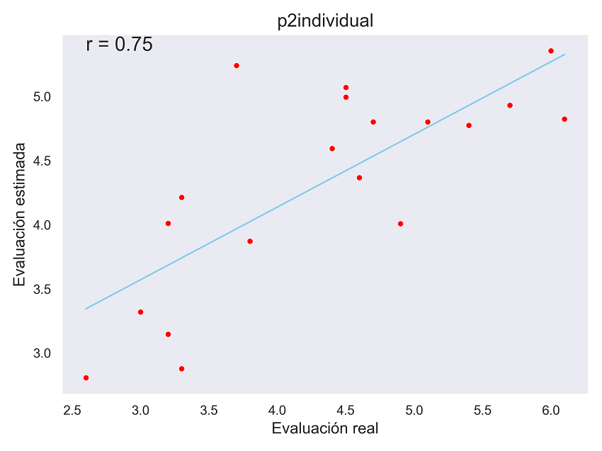 En la Figura 8, se presenta la precisión alcanzada por un modelo de regresión lineal construido a partir de las dimensiones del cuestionario de escritura en conjunto con la variable de cohorte con el fin de predecir los resultados de la segunda evaluación “Codificación limpia”. Se observa que existe una relación positiva mayor al primer modelo y significativa (r=0.75) entre las concepciones de la escritura y la capacidad de producir código limpio por medio de la utilización de buenas prácticas de desarrollo apropiadas al dominio del caso de estudio abordado por los estudiantes.