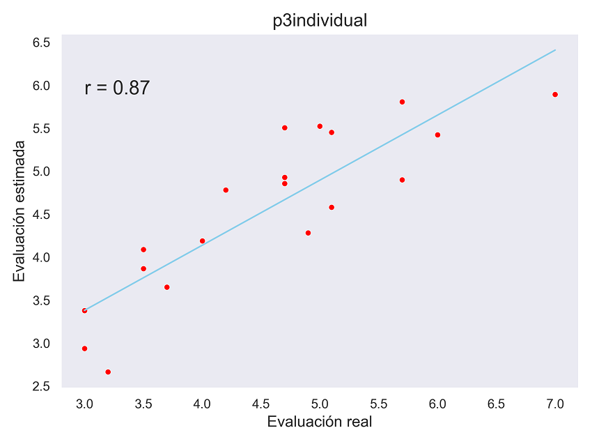 En la Figura 9, se presenta la precisión alcanzada por un modelo de regresión lineal construido a partir de las dimensiones del cuestionario de escritura en conjunto con la variable de cohorte con el fin de predecir los resultados de la tercera evaluación, “Arquitecturas limpias”. Se observa que existe una relación positiva mayor que los dos modelos anteriores y significativa (r=0.87) entre las concepciones de la escritura y la capacidad de producir código limpio por medio de la utilización arquitecturas limpias durante la estimación del esfuerzo de los procesos de desarrollo de software coherentes con el dominio del caso de estudio abordado por los estudiantes.