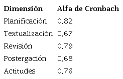 Las percepciones sobre el proceso de escritura fueron recogidas por medio del cuestionario propuesto por Vine-Jara (2020), el que fue diseñado a partir de los trabajos de Difabio de Anglat (2012) y Rodríguez Hernández y García Valero (2015). Este cuestionario de 36 preguntas evalúa cinco dimensiones: planificación, textualización, revisión, postergación del inicio de la escritura y actitudes hacia la escritura. Se optó por este instrumento debido a que recoge información tanto del proceso como de las actitudes relacionadas con la escritura y, además, porque fue diseñado e implementado por la autora para ser aplicado en el contexto chileno, lo que da cuenta de su pertinencia cultural. La autora comparte el instrumento, de manera íntegra, en (VINE-JARA, 2020).
