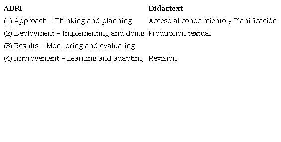 En contraste con esta larga tradición, la enseñanza de la programación ha cobrado especial relevancia en los últimos años, sobre todo debido al interés creciente de incorporar esta disciplina en la formación primaria y secundaria (DAPOZO et al., 2016; TORRENT MALUJE, 2019). Curiosamente, algunas de las experiencias didácticas relacionadas con la enseñanza de la programación suelen presentar aspectos muy cercanos a la didáctica de la escritura, tanto en el metalenguaje utilizado como en la perspectiva procesual de su enseñanza. Un ejemplo de ello es el extensivo uso de la metodología ADRI (Approach, Deployment, Result, and Improvement), la que se define como “an analytical tool which is a well-known quality assurance model for self-review and external review and is used extensively in the education and business sectors” (MALIK y COLDWELL-NEILSON, 2017, p. 1096). Las etapas de esta metodología se presentan a continuación en la Tabla 2, a la vez que se realiza un paralelo entre estas y la propuesta del grupo Didactext (DIDACTEXT, 2003).