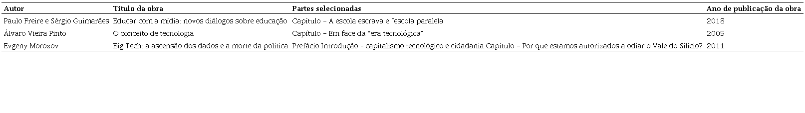 Foi selecionado o primeiro capítulo de cada obra, pelo fato de apresentar uma visão panorâmica sobre o assunto a ser tratado no corpo da obra e, assim, possibilitar o diálogo entre os autores. Em específico, sobre a obra de Morozov (2018), foram incluídos o prefácio e a introdução do seu livro, por complementarem as temáticas para este estudo. Vale ressaltar que as obras de Freire e Guimaraẽs (2011) e de Pinto (2005) não possuem prefácio e introdução.