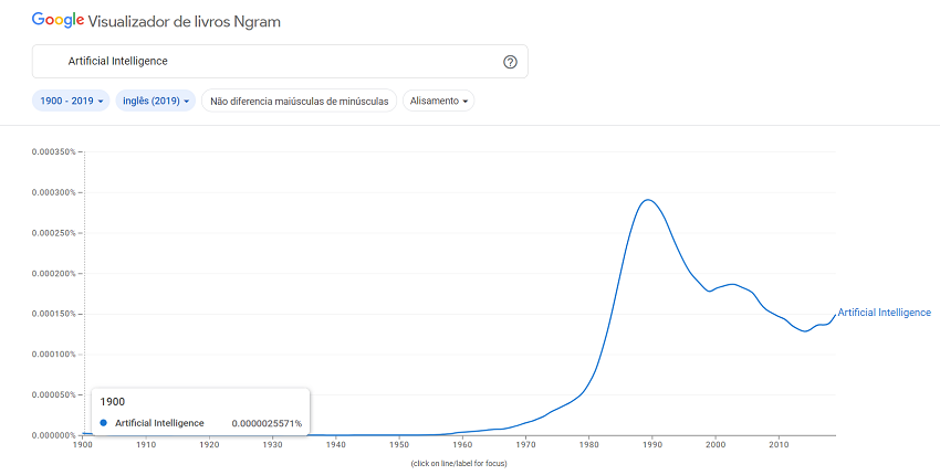 Optamos por trazer um breve recorte histórico do ciclo de vida da IA, por meio de dados levantados pelo Google ( 2023) ( Google Ngram), cujo gráfico ( Figura 1) apresenta uma curva de períodos em que produções acadêmicas estiveram em evidência, incluindo livros e artigos. Trata-se de uma “[...] ferramenta de pesquisa baseada na análise de milhares de livros digitalizados [...] estendem os limites da pesquisa quantitativa rigorosa para uma ampla gama de novos fenômenos que abrangem as ciências sociais e as humanidades” ( MASSAROO; MESQUITA, 2020, p. 125) . Neste estudo, o Ngram é uma ferramenta útil para uma abordagem exploratória sobre o contexto histórico da IA, a fim de compreender os períodos mais tendenciosos e os de refluxo sobre o tema.