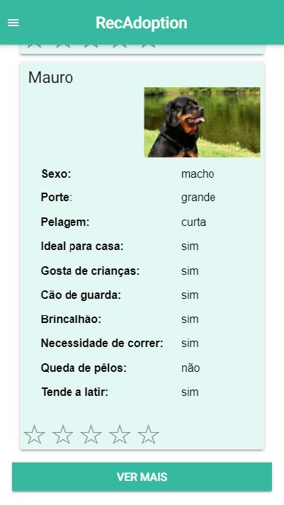 O modelo dos itens de usuário contém os mesmo atributos ( tags) que o modelo de usuário, porém com informações sobre as particularidades do cão — moradia ideal, o porte, a pelagem. Uma representação do padrão de itens é demonstrada na Figura 10, a tela principal do aplicativo proposto neste trabalho.
