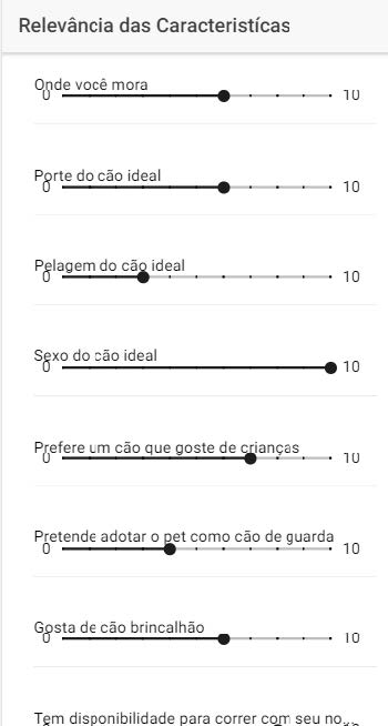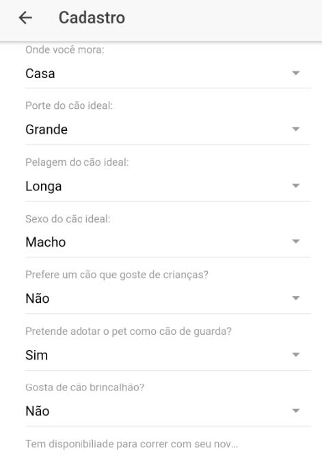 Esses questionários incluem perguntas com a intenção de coletar informações sobre a vida do adotante, a fim de definir seu estilo de vida — se mora em casa ou apartamento, se possui jardim ou área de lazer, se tem filhos pequenos ou já crescidos, se já teve ou tem algum outro animal de estimação, se pretende ter um cão companheiro ou um cão de guarda. Ao definir esse perfil, no final, são recomendadas raças de cães que se encaixam naquela descrição. Ressalta-se que algumas informações utilizadas para o cálculo da similaridade foram influenciadas pelos questionários citados anteriormente. O objetivo é sempre garantir uma melhor indicação.