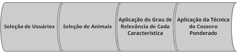 A Metodologia consistiu na análise do Banco de Dados pré-existente, utilizado do aplicativo RecAdoption, cujas informações, como a avaliação de cada item por usuário, são relevantes para esta pesquisa. Os dados utilizados nos experimentos, portanto, foram obtidos de forma offline e analisados em quatro fases, conforme a Figura 15: Seleção de Usuários, Seleção de Animais, Aplicação do Grau de Relevância de Cada Característica e a Aplicação da Técnica do Cosseno Ponderado.