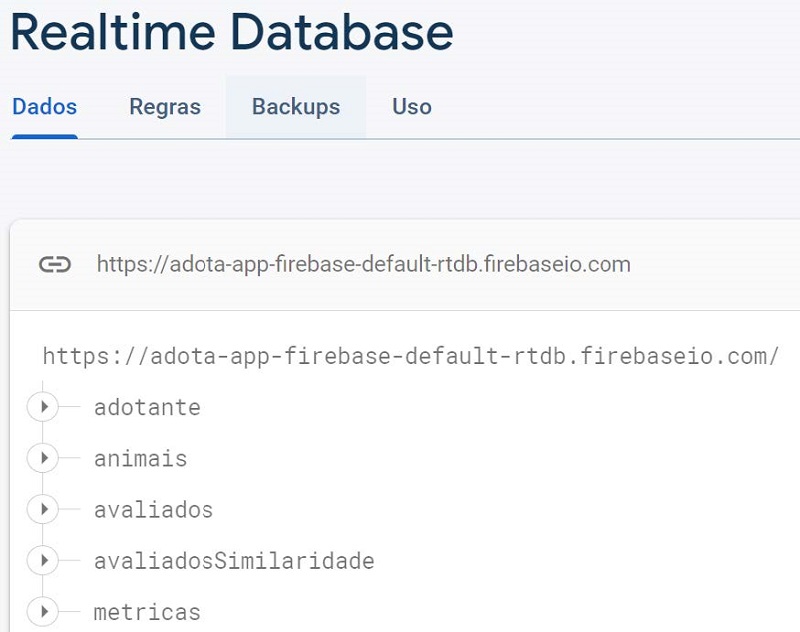Os experimentos realizados utilizaram dados offline oriundos de cinco tabelas. E as características do cachorro são persistidas em um banco de dados NoSQL do Firebase, conforme Figura 17. As três primeiras tabelas eram pré-existentes e tiveram seus dados usados, sendo a Adotante a única destas que sofreu atualizações durante este trabalho. As demais são novas e manipuladas para armazenar dados recentes do aplicativo.