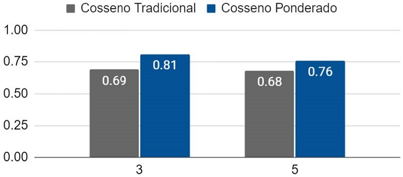 Nota-se que no Gráfico 18 tem-se no eixo y valores referentes à similaridade dos itens e no eixo x a posição dos itens. Portanto, enquanto o MAP do Experimento 1.a, nas posições 3 e 5, possui valores de precisão 0,69 e 0,68, respectivamente, o Experimento 1.b, na posição 3, tem precisão de 0,81, e na posição 5 tem 0,76. Logo, o Experimento 1.b referente à aplicação da Técnica do Cosseno Ponderado, apresentou melhores valores.