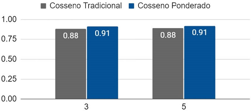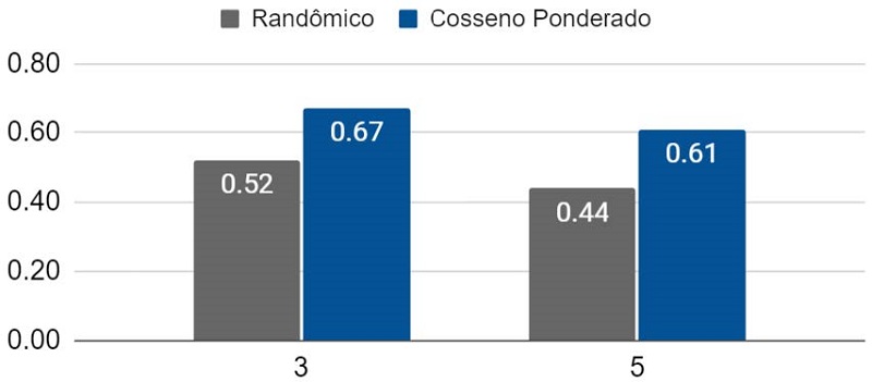 Nota-se que, no Gráfico 20, tem-se no eixo y valores referentes à similaridade dos itens, e no eixo x a posição dos itens. Por isso, ao passo que o MAP do Experimento 2.a, nas posições 3 e 5, possui valores de precisão 0,52 e 0,44, nesta ordem, o Experimento 2.b, na posição 3, tem precisão de 0,67 e, na posição 5, possui 0,61. Assim, o Experimento 2.a, relativo ao emprego da Técnica do Cosseno Ponderado, apresentou valores superiores.