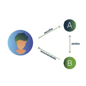 Baseada em conteúdo: a principal vantagem desta é não precisar de feedback prévio para começar a recomendar algo útil, pois, na falta de registros, o sistema monta um modelo de usuário com as informações de perfil, de cadastro ou de algum item avaliado no passado. A Figura 2 demonstra isso graficamente, o conteúdo B, similar ao A, será recomendado ao usuário. A desvantagem é que cria uma bolha de indicações, gerando uma lista muito similar, com pouca variedade. Outra desvantagem é que o sistema não vai gerar boas recomendações, se o usuário não possuir alguma característica que possa rotulá-lo, ou se não tiver avaliado anteriormente algum item no sistema.