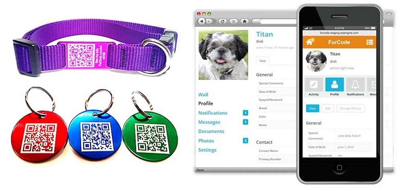 Outra tecnologia é a coleira com Quick Response Code - QR CodeFigura 4, inserido no mercado pela FurCode. Consiste numa coleira com medalha de identificação com QR Code, que possibilita acessar a página do animal. Por meio desta, a pessoa que encontrar o animal utilizando a coleira pode ter acesso às informações de contato do adotante, telefone do médico veterinário, fotos e informações médicas. Além do QR Code, a medalha pode conter o link da página do animal, para caso o indivíduo que o encontre não tenha acesso a um dispositivo que lê esse tipo de código.