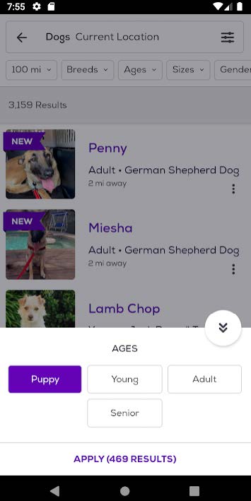 Os aplicativos de busca também são utilizados para cadastrar animais que tenham fugido de casa ou se perderam de seus adotantes. Através deste cadastro, os adotantes inserem fotos e informações do animal desaparecido e os dados de contato. Há o exemplo do appPetfinder Adoptable Pets, visto na Figura 5 e disponível para Android e iOS, que se constitui num app de busca de perdidos e abandonados. A interface conta um mapa mostrando os animais disponíveis mais próximos do adotante.