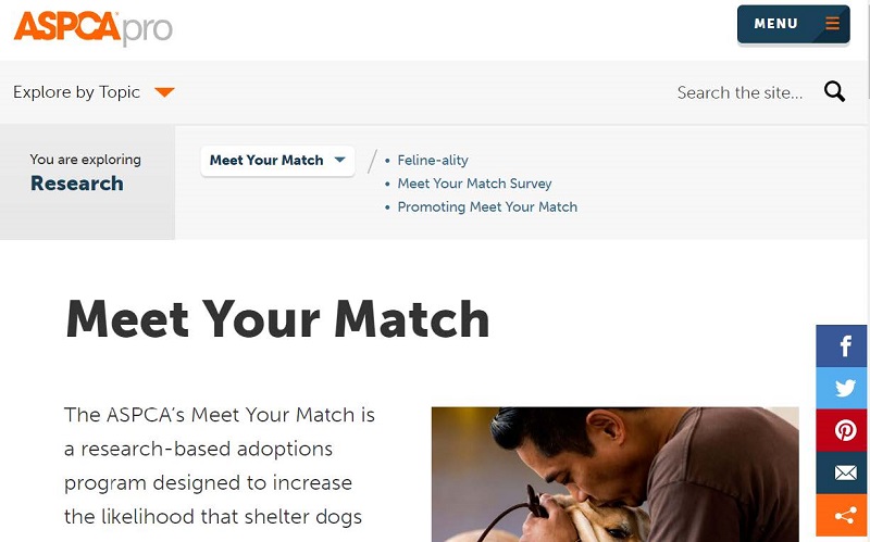 A associação também possui um programa de adoção baseado em pesquisa, chamado Meet Your MatchFigura 8, que une adotantes a animais cujos perfis sejam compatíveis, semelhante ao que o projeto deste trabalho propõe, por meio de um app. O ASPCA realizou uma pesquisa de cinco anos analisando como o programa Meet Your Match Feline-ality afetou adoções, taxas de retorno, tempo de permanência e índices de eutanásia de gatos. O software também é aplicado para cães, através do Meet Your Match Canine-ality.