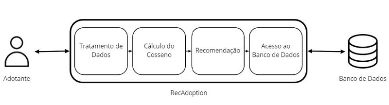 Nesta seção será abordada a solução proposta, denominada RecAdoption, que consiste em indicar cães utilizando a técnica do cosseno ponderado trazendo os dados de gostos distintos do adotante considerando as características do pet. Também será apresentado o funcionamento do sistema, além das tecnologias utilizadas na sua construção. Por fim, será demonstrado o funcionamento de um protótipo de appmobile para recomendação de cães disponíveis para adoção. O fluxo da arquitetura que será explicitado nessa seção é visualizado na Figura 9.
