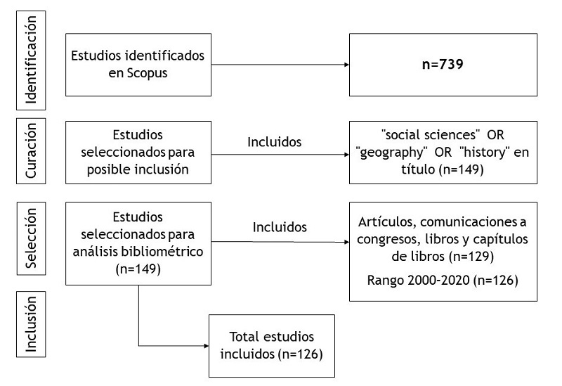 En primer lugar, tras revisar los resúmenes de los documentos resultantes, se percibió que la inclusión de los comandos en los campos contemplados (título, resumen y palabras claves) incluían publicaciones no acordes con el objeto de estudio en el que se había situado el foco. Esto llevó a una modificación parcial en el motor de búsqueda, de forma que el comando de descriptores relacionados con las ciencias sociales (“social sciences” OR “geography” OR “history”) cumpliera con la condición de aparecer en el título de la publicación. Esta restricción redujo la muestra a 145 documentos.