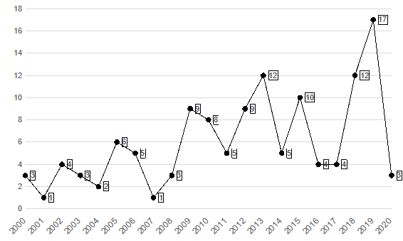 Considerando que se incluyeron las publicaciones dentro del rango 2000-2020 ( Figura 2), ambos incluidos, se observa una evolución discontinua, con continuos crecimientos y descensos, generándose un rango de 16 publicaciones entre el año más productivo (17 en 2019) y que menos documentos registró (2001 con 1). De todos modos, si se aprecia un aumento de la producción en el periodo más reciente (2010-2020), respecto al periodo inicial estudiado (2000-2010).
