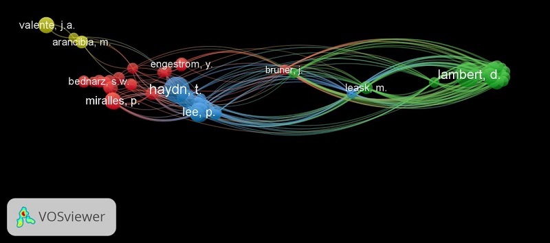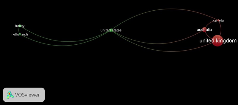 Se generaron 2 clústers en función de las coautorías, precisando aclarar que el tamaño de los nodos es consecuencia de su importancia, siendo mayor a medida que esta crece. Reino Unido, Australia y Canadá manifiestan una colaboración estrecha entre los mismos (clúster rojo), al igual que sucede en el conjunto verde (Turquía, Países Bajos y Estados Unidos). Señalar que Estados Unidos se convierte en el país con la mayor red de colaboración al vincularse con todos los que superan el filtro estipulado. También es relevante indicar que países con los registros de producción más altos, como España (24 publicaciones), Grecia (10) o Eslovenia (7), no establecen redes colaborativas relevantes (al menos 2 publicaciones con un mínimo de 20 citas como criterio para su inclusión) para la investigación en el objeto de estudio. De este modo, la colaboración entre países no queda sujeto a un mayor nivel de producción, sino a la generación de sinergias e intereses investigadores compartidos entre los autores.