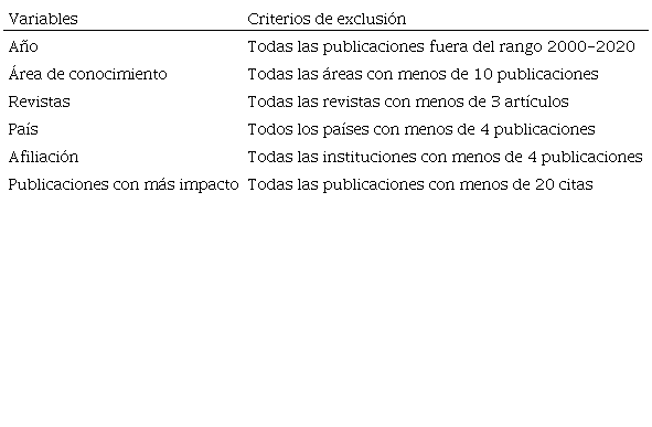 Atendiendo al análisis de la producción científica, se estipularon las variables siguientes: año, para explorar la evolución de los artículos en el tiempo; área de conocimiento, para saber en qué ámbitos temáticos se indexan los artículos; revistas, para identificar las publicaciones más prolíficas respecto al objeto de interés de este trabajo; país, para saber en qué países se investiga más sobre el fenómeno de estudio; afiliación, para examinar las instituciones que tienen una mayor producción; publicaciones con más impacto, para conocer cuáles eran los artículos más relevantes en el ámbito de estudio en el momento de realizar la investigación. No todos los resultados han sido considerados, sino que se establecieron criterios de exclusión en función de las variables consideradas, los cuales se especifican a continuación ( Tabla 1).