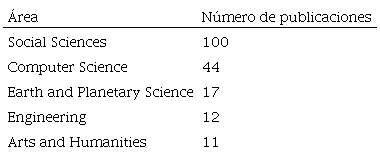 El área de ciencias sociales registró la mayor producción (100), siendo más del doble que la de ciencias de la computación que, con 44 publicaciones, ocupa el segundo lugar. Llamó la atención la pluralidad en las áreas, diferenciándose dos ámbitos: los campos de conocimiento más arraigados a los contenidos de sociales (ciencias sociales, ciencias de la tierra y el planeta, artes y humanidades); y el ámbito tecnológico, al tener la variable TIC y tecnología educativa como herramienta/instrumento vehiculado al proceso educativo sobre las materias de sociales.