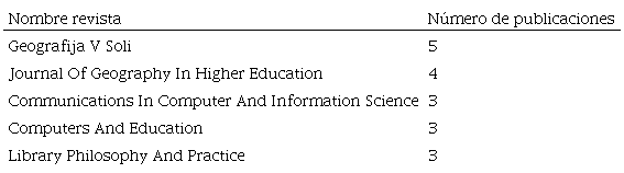 Partiendo del criterio de exclusión estipulado de menos de 3 publicaciones sobre la temática de análisis ( Tabla 3), el primer lugar lo ocupa la revista Geografía V Soli, del ámbito de las ciencias sociales. Vinculado a este terreno, también encontramos otras publicaciones como Journal Of Geography In Higher Education o Library Philosophy and Practice. El resto están vinculadas al campo de la tecnología, como ya ocurriera en las áreas de indexación. Cabe destacar que, pese a que España es el país más prolífico en cuanto a producción sobre el tema, ninguna de las revistas es española, debido en gran parte al menor número de estas indexadas en Scopus y en posiciones relevantes respecto a métricas de impacto.