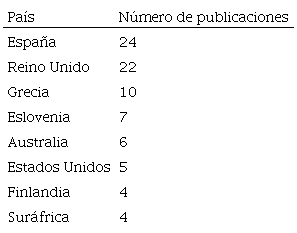 España lideró la producción científica, atendiendo a los comandos de búsqueda establecidos, seguida de cerca por Reino Unido (24 y 22, respectivamente). Existe un predominio mayoritario de países europeos entre los más prolíficos, no encontrado hasta la 5º posición a Australia con 6 publicaciones. También aparecen del continente americano (Estados Unidos, con 5 publicaciones) y el africano (Suráfrica, con 4), aunque con pocas publicaciones si consideramos todos los años que fueron considerados para el estudio.
