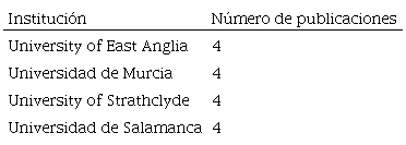 Cabe señalar que dichas instituciones son universidades de los dos países más prolíficos (España y Reino Unido), algo lógico si consideramos los resultados de la variable anterior. Entre dichas instituciones, la universidad de Salamanca y Murcia comparten primera posición con 4 publicaciones, al igual que las de East Anglia y Strathclyde.