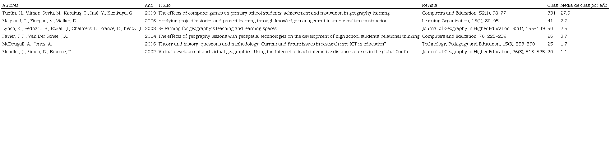 La publicación más relevante es la de Tüzün et al.(2009), logrando las 331 citas y un promedio de 27.6 citas por año. Este estudio se centró en una experiencia con videojuegos en educación primaria para la enseñanza de geografía, demostrando que la utilización de dicho recurso TIC mejoró el rendimiento académico del alumnado y su motivación intrínseca. Vinculado a la temática específica de la geografía, encontramos otras 3 publicaciones. Por un lado, relacionadas con el contexto universitario, el trabajo de Favier y Schee (2014) apuesta por técnicas geoespaciales para la mejora de dicho pensamiento en estudiantes de educación superior; mientras que el estudio de Mendler, Simon y Broome (2002), analizó los pro y contras de un programa formativo de postgrado online en Geografía respecto a su diseño tecno-pedagógico, organizativo y de accesibilidad del alumnado. Por otra parte, Lynch et al.(2008) fundamentan la implementación de las TIC para la enseñanza de la geografía a todos los niveles. Subrayar que el segundo lugar, con 41 citas, lo ostentó la investigación de Maqsood, Finegan y Walker (2006), donde las TIC favorecían el aprendizaje basado en proyectos para empresas mediante el trabajo sobre análisis históricos de los proyectos en desarrollo. De una forma más general, McDougall y Jones (2006) defendían el papel de las TIC en el desarrollo de los procesos formativos, encontrándose las ciencias sociales entre sus contenidos.