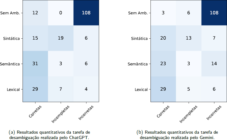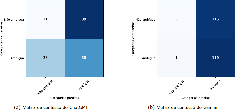 Nossos resultados indicaram melhorias significativas entre os diferentes modelos, assim como diversas vantagens e limitações. Nesse sentido, nosso trabalho apresenta as seguintes contribuições: 1) disponibiliza um conjunto de dados formatado para testar a ambiguidade linguística em modelos de linguagem natural no português brasileiro, que até o nosso conhecimento é o primeiro proposto na literatura; 2) é o primeiro trabalho a informar à comunidade científica sobre as limitações do ChatGPT e do Gemini em compreender fenômenos linguísticos complexos, como a ambiguidade na língua portuguesa; 3) apresenta uma metodologia para avaliar esses modelos quanto ao fenômeno da ambiguidade; e 4) demonstra, por meio de resultados qualitativos e quantitativos, qual dos dois modelos lida melhor com esses fenômenos linguísticos.