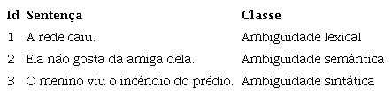 Seguimos a proposta de Cançado (2005) para o português brasileiro, que considera o nível de uso da língua e inclui a ambiguidade lexical, com casos de homonímia, polissemia, ambiguidade semântica e ambiguidade sintática.