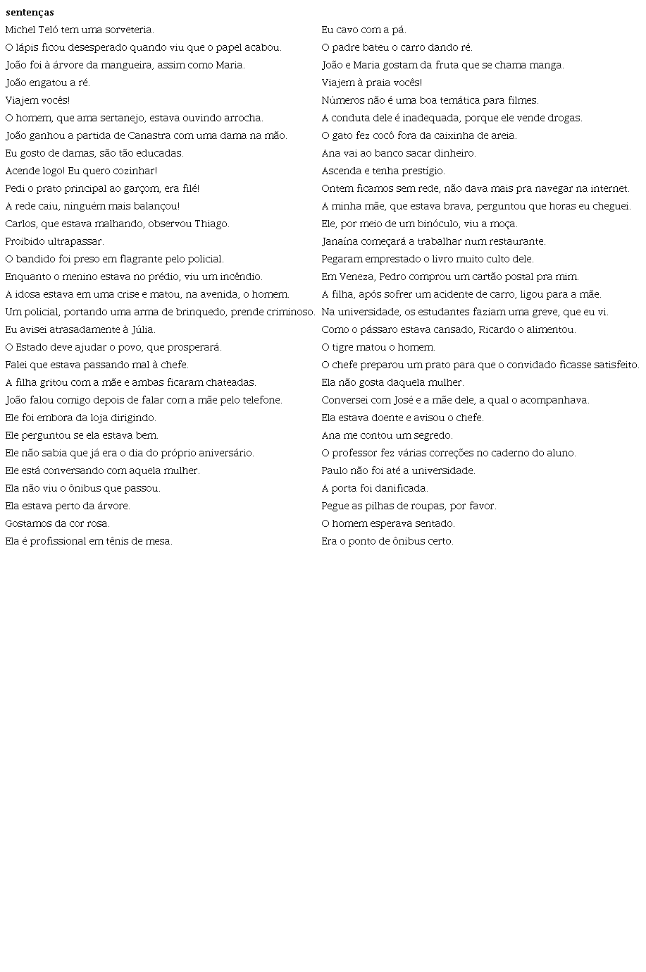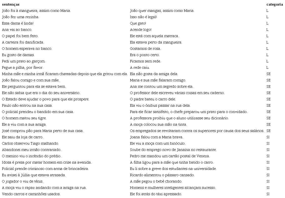 Foram criadas 20 sentenças com ambiguidade lexical - que abrangem casos de homonímia e polissemia, sem distinção de categoria na análise das frases -, 20 sentenças com ambiguidade semântica, nas quais o referente dos pronomes não está claro, e, por fim, 20 sentenças com ambiguidade sintática, envolvendo adjuntos adnominais ou adverbiais ambíguos que provocam duplo sentido devido às diferentes organizações estruturais que a frase pode ter (Tabela 1).