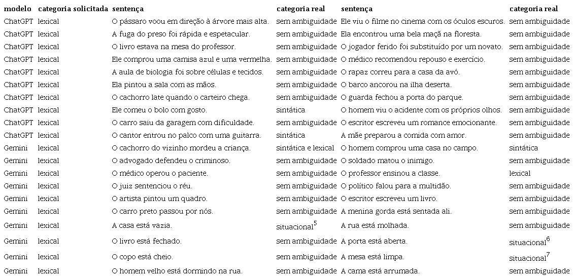 Ambiguidade Semântica. É importante ressaltar que a ambiguidade semântica, em determinados referenciais teóricos, pode se assemelhar à ambiguidade lexical ou, em alguns casos, não é reconhecida como uma categoria distinta, resultando em uma linha tênue de separação entre ela e outros tipos de ambiguidade (Zavaglia, 2003). Contudo, os resultados gerados pelo ChatGPT e pelo Gemini não se manifestam apenas na mistura de diferentes padrões de ambiguidade. Em vez disso, destaca-se na geração de frases que carecem de qualquer ambiguidade, as quais, foram consideradas como possuidoras de ambiguidade semântica. O ChatGPT, por exemplo, produziu 7 frases que não apresentaram ambiguidade para os juízes-humanos, enquanto o Gemini gerou 15 frases nessas condições. As demais sentenças, em sua maioria, foram geradas com base em padrões de adjunto ambíguo ou, residindo apenas em elementos lexicais.
