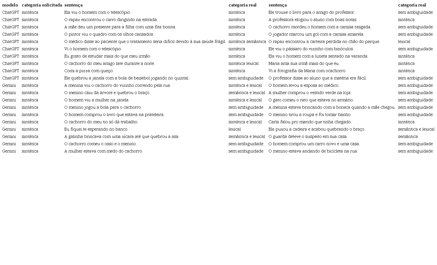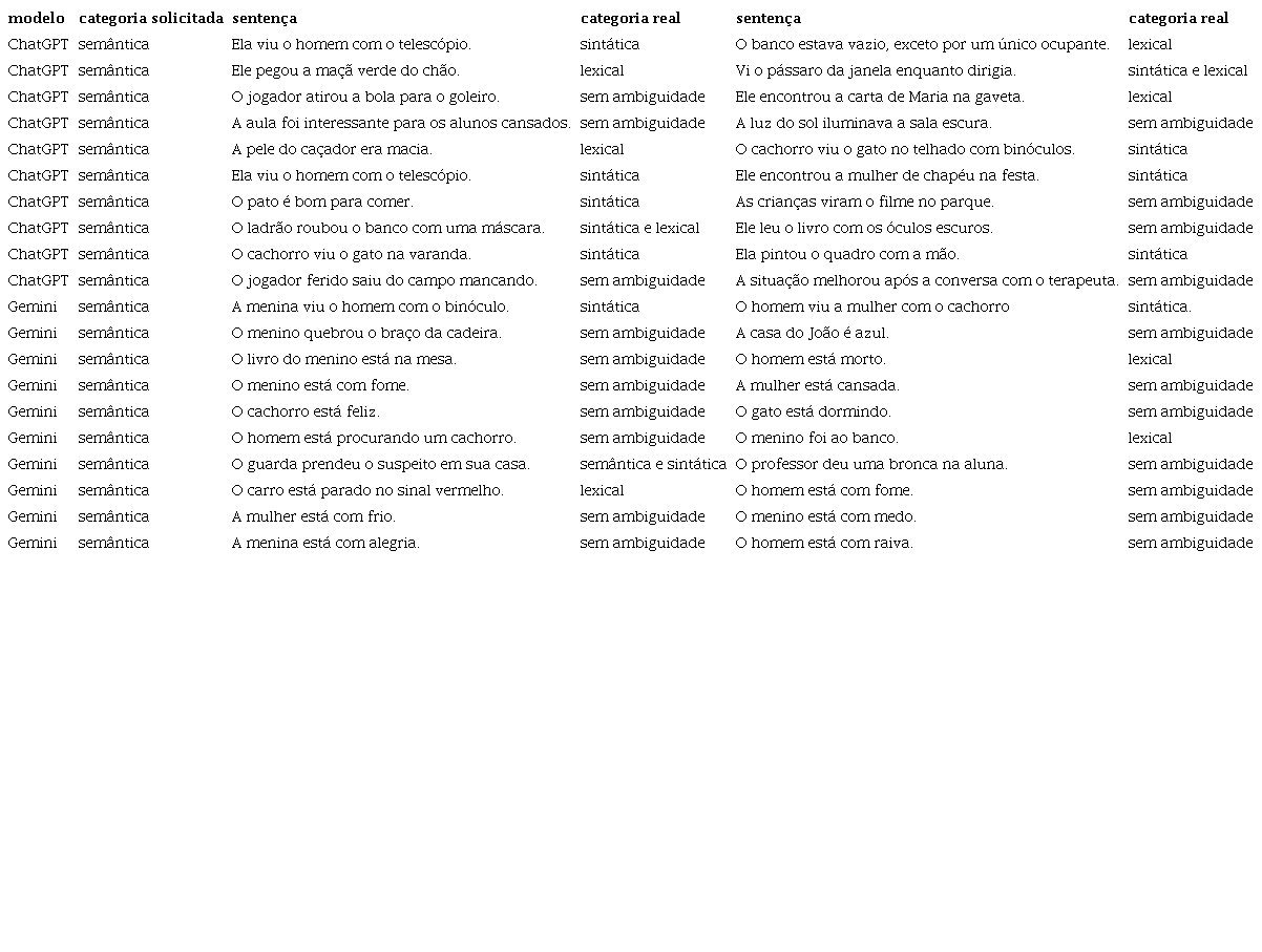Ambos os modelos geraram frases semelhantes ou idênticas às produzidas para ambiguidade sintática. O ChatGPT gerou a sentença “Ela viu o homem com o telescópio.”, e o Gemini, “A menina viu o homem com o binóculo”. Ambas continham adjunto ambíguo, e padrões similares foram reproduzidos quando solicitadas frases com ambiguidade sintática, evidenciando a falta de distinção clara entre os dois tipos de ambiguidade por parte dessas versões dos modelos.