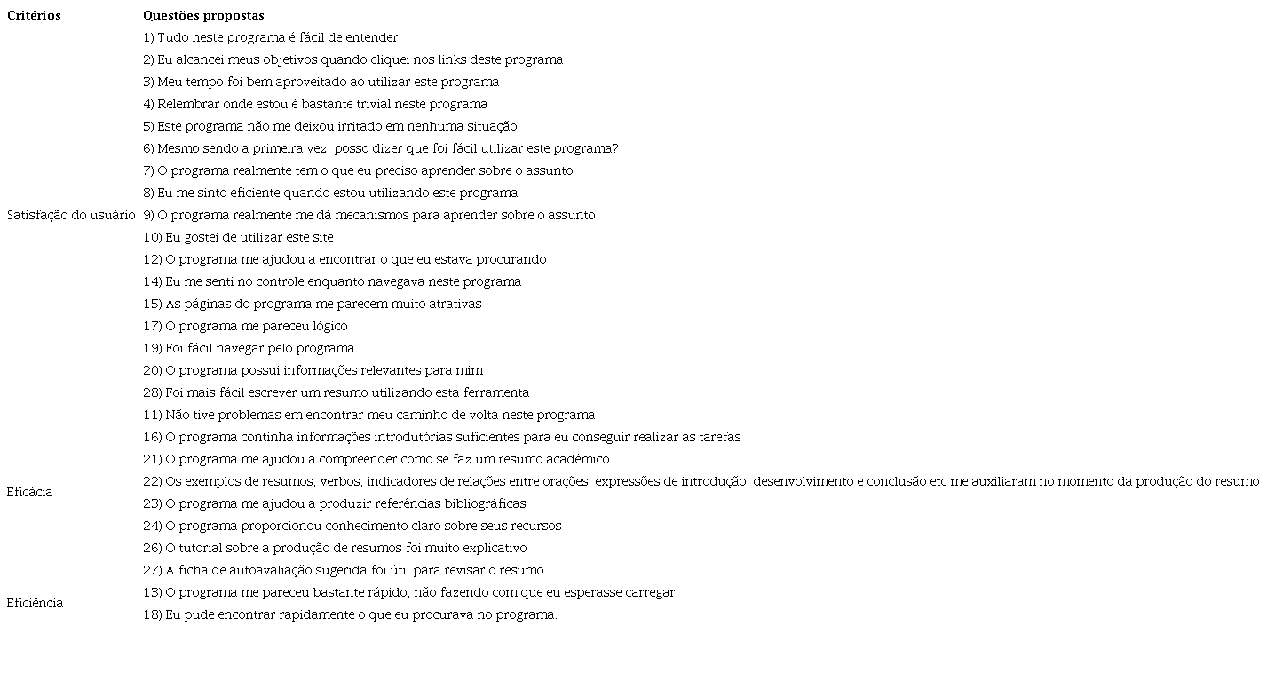 Na segunda etapa, produzimos vinte e oito questões que se enquadraram nos critérios de “satisfação”, “eficácia” e “eficiência”, nessa ordem de prioridade. Essa escolha se deu porque estávamos interessados em investigar se os usuários se sentiram satisfeitos e se obtiveram sucesso na realização das tarefas, já que essas prerrogativas os motivariam a usar o software novamente.