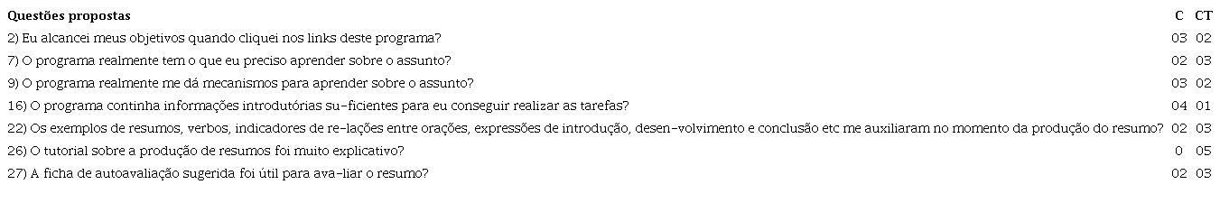 Segundo os discentes, a ferramenta permitiu bom alcance dos objetivos durante o processo de escrita do resumo. Além disso, eles(as) afirmaram que o software oferecia informações relevantes e suficientes para realizar as tarefas e ainda disponibilizava bons mecanismos e informações para aprender a fazer resumos.