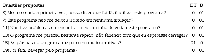 Ao analisarmos as respostas indicadas na Tabela 2, constatamos que houve avaliação negativa quanto os critérios de eficácia (dificuldade em encontrar caminhos de volta), eficiência (lentidão do programa) e satisfação. Esse último critério teve maior destaque, principalmente no que se refere à dificuldade de navegação (o que talvez possa ter causado irritação) e ao layout da interface, que não pareceu atrativo.