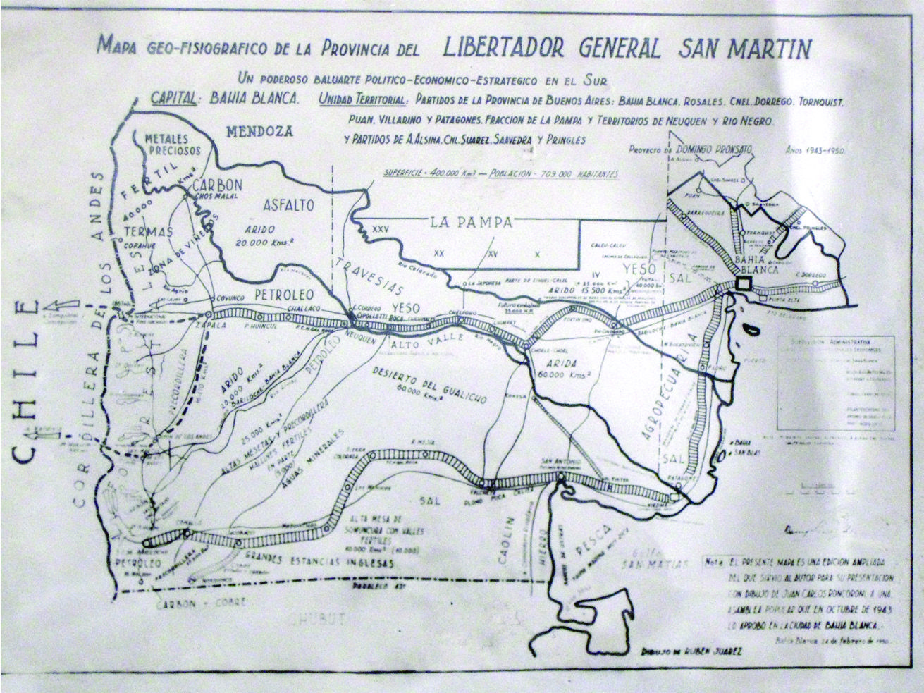 no de los ejes vertebradores de esta vasta unidad territorial estaría constituido por una infraestructura de comunicación y transporte internacional en la que el mismo Pronsato venía trabajando desde 1947 junto a su amigo Juan Isoardi, el Municipio local y sus pares chilenos en Valdivia: el ferrocarril trasandino austral (López Pascual, 2014) (Figura 3). Si bien la provincialización de La Pampa en 1952, de Río Negro y de Neuquén, ambas en 1955, significaron la definitiva frustración del proyecto capitalizador de Bahía Blanca, las ideas en torno a la centralidad de la ciudad no fueron abandonadas. Por el contrario, las tratativas en torno al sistema ferroviario que conectaría a Bahía Blanca con Chile se sostuvieron y la planificación infraestructural pareció cobrar mayores adherentes a la vez que ganaba en complejidad. Luego de la realización del Congreso Trasandiniano en 1957 y con la anuencia de quienes ocupaban los distintos niveles del poder político, el proyecto también contempló el trazado y la pavimentación de la ruta nacional 22, la instalación de una represa hidroeléctrica en la zona de Huelches y la ampliación de la capacidad de almacenamiento y operaciones del puerto de Ingeniero White (López Pascual, 2016a). No obstante, este proceso de planificación y movilización que involucró a distintos sectores políticos, sociales y productivos de la ciudad y de la zona circundante no se dio de manera tersa, sino que se insertó y entrelazó con los debates teóricos acerca de las vías de ordenamiento general y desarrollo material de la región patagónica que se habían instalado en la agenda intelectual nacional desde fines de los años 30. Así, el análisis y las conceptualizaciones del ingeniero Ricardo M. Ortiz[13] observaron otro panorama y estipularon diferentes metas, tanto para las tierras sureñas como para el rol que le cabía a Bahía Blanca en su evolución (López Pascual, 2016a, 2016c). A diferencia de quienes entendían que la ciudad contaba con “derechos naturales” a comandar el destino de la patagonia y que se lamentaban por la falta de reconocimiento a esas supuestas prerrogativas, Ortiz defendió la necesidad de un desarrollo autónomo de la región en la que Bahía Blanca actuaría de complemento y sostén del crecimiento general, estimulando así la descentralización económica del litoral rioplatense y la producción fabril.