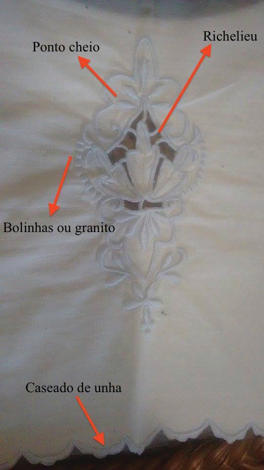 No Rio de Janeiro: tinha uma senhora lá em Niterói que dava os bordados assim pra gente bordar. A gente ia até Niterói, pegava os bordados e vinha. Aí a minha vó bordava. Eu fazia assim um pontinho de corda, umas bolinhas assim, não era, não fazia muita coisa. Era lençóis, jogos de lençóis. Era linho daquele bem fininho e tinha percal. Aí, a minha tia me ensinou a fazer ponto Paris e eu fazia as bainhas, as bainhas dos lençóis. Pregava os forros também tudo a ponto Paris (Rita, 2015, entrevista).