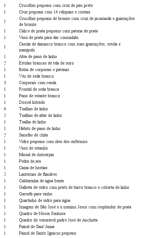 Chart 1. Liturgical objects found on the frigate of the priests, Rio de Janeiro, December 22, 1759.