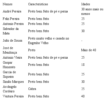 O último item dessa parte do inventário diz respeito aos seus 12 escravos. Eram homens com idades entre 18 e 40 anos, com exceção de João de Sousa, que foi identificado como preto muito velho.
