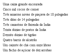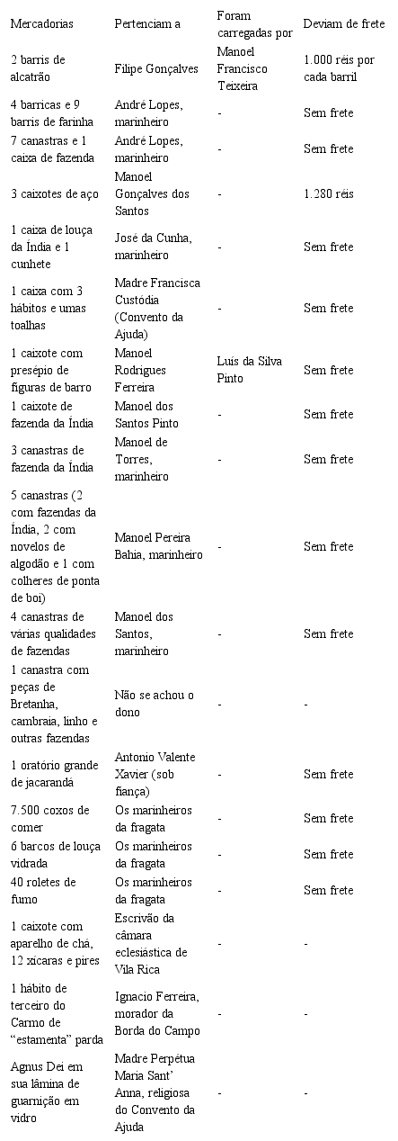 Dentre as mercadorias encontraram-se rolos de fumo, um barril de pregos, remédios para a botica, livros variados para diferentes padres versando sobre religião e navegação, doces, biscoitos, ferramentas, um caixote com raízes, mil cocos de comer, piaçava, barril de azeite de carrapato, mó de ferreiro, bandejas de pratas, 17 canastras de roupas e trastes de uso dos padres, louças da Índia e de estanho e um “caixão pequeno com suas gavetas em que vem a botica da fragata” (ANTT, Catál. Desemb. Paço, maço 2038, cx. 1978).