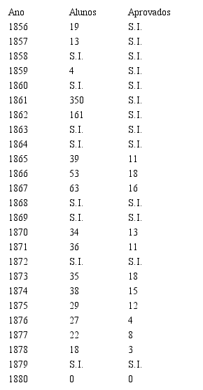 Ao que tudo indica, a reorganização em 1861 teve efeito, pois, se no ano anterior somente quatro alunos haviam se matriculado, em 1861 eles passaram a 350, maior número de matriculados da história da instituição, conforme a Tabela 1. Em 1862, esse contingente diminuiu consideravelmente, mas ainda assim permanecia bem alto, sendo 160 matriculados.